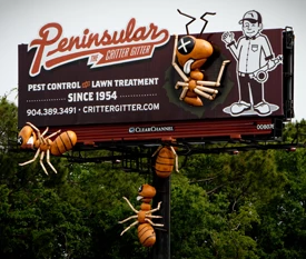 JACKSONVILLE, Fla. — A new billboard featuring 15-feet tall, three-dimensional ants is catching the attention of drivers heading south on I-95 through Jacksonville, Fla. Peninsular Pest Control’s new billboard is creating buzz and helping the company with its rebranding efforts, according to President Carolyn Richardson.