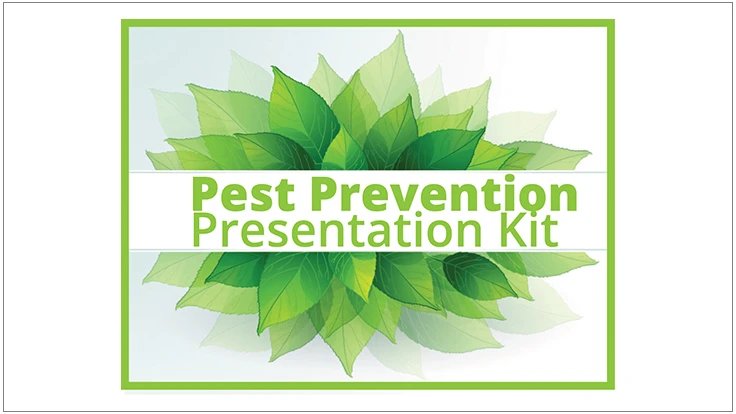 The 15-20 minute presentation focuses on steps a homeowner can take to remove the three life requirements of pests: food, shelter and water. Shown in vivid photographs, the 21-screen PowerPoint file is ready to customize with the company’s name, logo, phone and website.