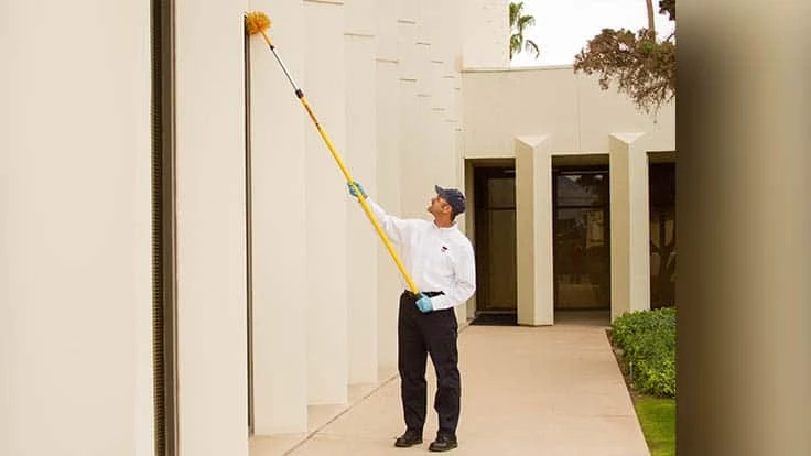 (Pictured: A Truly Nolen service professional dusting for spider webs as part of the company's exterior treatment program.)