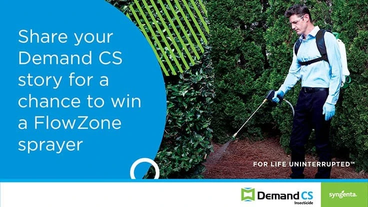GREENSBORO, N.C. — Syngenta wants to hear from pest management professionals who use Demand CS insecticide. PMPs can submit their stories for a chance to win one of eight FlowZone Typhoon 2 variable-pressure, battery-powered sprayers every week through July 31.