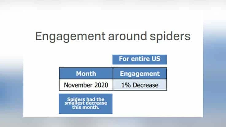Engagement around the topic of spiders decreased 1% from October 2020 to November 2020, representing the smallest decrease out of any other core pest during that time.