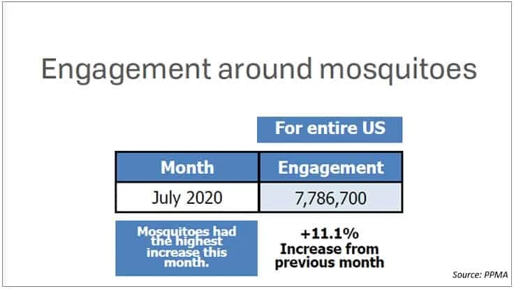 - Engagement around the topic of mosquitoes increased 11.1% from June 2020 to July 2020, representing the highest increase out of any other core pest during that time period.