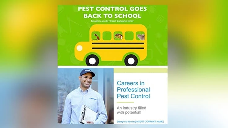 For companies looking to connect with high school, technical and vocational students considering a future in the skilled workforce, the Careers in Pest Control presentation emphasizes the pest control industry as a rewarding and viable career path outside of the typical 4-year college degree. It is updated to include information about pest control as an essential service during the COVID-19 pandemic and features new industry and outlook statistics, growth projections, and allows customization for companies to share more about their business and job opportunities.