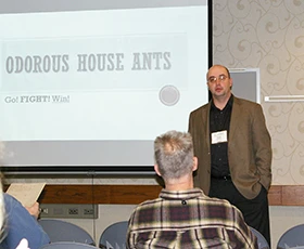 Speakers Ted Granovsky, Dale Hodgson, Pat Hottel, Jay Kelley, Drew Martin, Jeff McGovern, David Mueller, Arnold Ramsey, Mark (Shep) Sheperdigian, and Gerry Wegner were present, and in consultation with the others present decided to proceed with the conference program despite Purdue campus closure, 8-10 inches of snow on the ground and blizzard conditions! With Shep, Scott Robbins, Gene White, Ted Granovsky and Jeff McGovern filling in for speakers who couldn’t get to Purdue, the updates on spiders, flies, carpenter and odorous house ants, and rodents were admirably covered.
