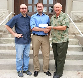 Adam Salyer (center), pictured being presented with the John V. Osmun Scholarship by Purdue's Gary Bennett (right) and Mike Scharf. |