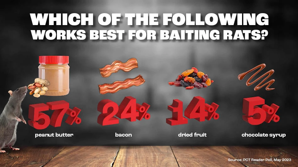 Concerns over peanut allergies were expressed by several of those who commented on our poll. Regardless, peanut butter remains a popular choice. According to those who responded to PCT's recent reader poll question, 57 percent said peanut butter was their top choice for baiting rats, followed by bacon (24 percent), dried fruit (14 percent) and chocolate syrup (5 percent).