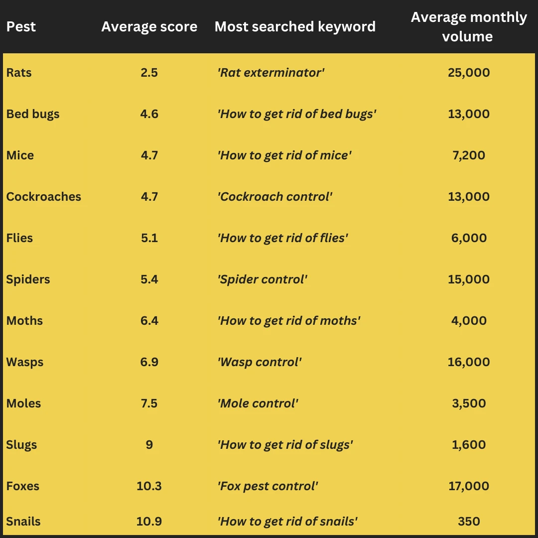 The analysis from the pest control specialist examined 10 keyword phrases relating to 12 different pests, each given a score based on their search volume figure.