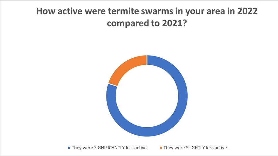 Last week's poll question asked: How active were termite swarms in your area in 2022 compared to 2021? PCOs answered termite swarms were significantly (80%) or somewhat (20%) less active in 2022 compared to 2021.