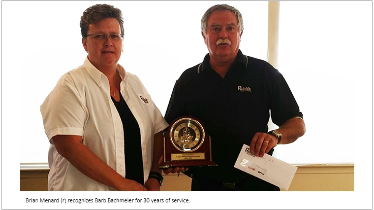Reliable’s growth has always depended on a quality service delivery in the field as well as the office. Reliable’s office manager, Barb Bachmeier, was presented with a 30 years of service recognition award and a weekend away.