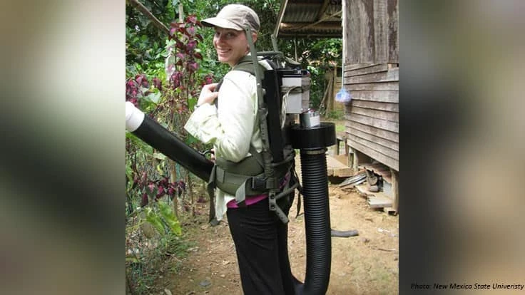 (Photo: Katie Young, NMSU post-doctoral fellow, carrying the vacuum used to sample blood fed mosquitoes in Borneo. (Photo: New Mexico State University)