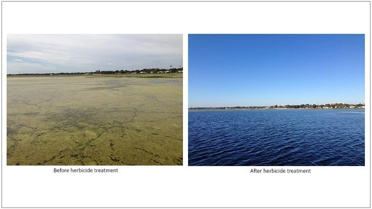 (Pictured left: Dense hydrilla with filamentous algae before herbicide treatment. Credit: Mark Heilman, Ph.D. Pictured right: Open water at two weeks after herbicide treatment. Credit Mark Heilman, Ph.D.)