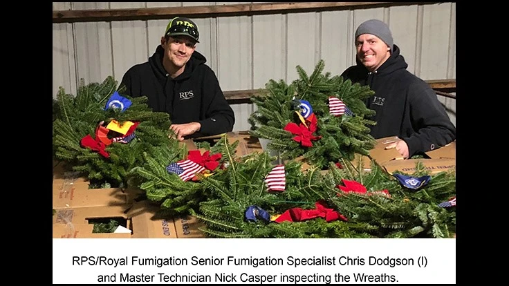 RPS/Royal Fumigation was contacted by WAA to assist in completing the export requirements of the French Ministry of Agriculture by fumigating 9,500 wreaths made at their Harrington, ME facility on November 8, 2018 for the December 15 Wreaths Across America Event. In a three-day itinerary, with a week’s notice, RPS coordinated with Maine USDA APHIS and WAA proprietary management to treat 9,500 package wreaths using the APHIS treatment schedule for Christmas Trees so a Phytosanitary certificate of treatment could be presented to the French Ministry of Agriculture. RPS’s Master Technicians George Milyo and Nick Casper, and Senior Fumigation Specialist Chris Dodgson transported fumigation equipment from New Castle, DE to Harrington, ME. The RPS Team conducted an onsite customization of the tarpaulin and close quarter facilities coordination for the completion of the treatment in a 12-hour time span to expedite the wreaths for shipment to France