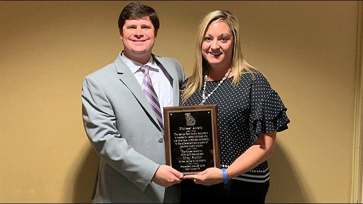 The Pioneer’s Award for 2018/2019 recognized Shay Runion for her service to our industry. Runion is the Chief HR Officer and Senior Vice President Professional Development with Arrow Exterminators. Presented June 23, 2019, Palm Coast, FL.