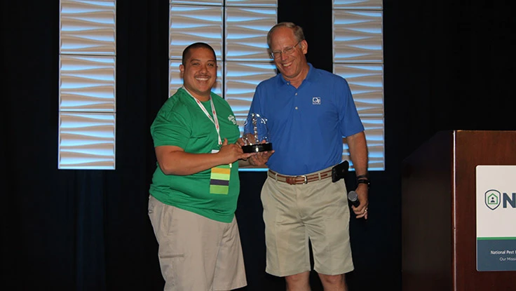 (Pictured: Sandwich Isle Pest Solutions' Ian Matteo is awarded the NPMA Gives award from new NPMA President Russ Ives.)