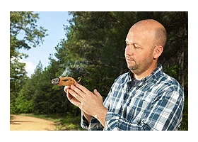 Chemist Charles Cantrell examines a burning dried male inflorescence from the breadfruit tree (Artocarpus altilis). People in Oceania routinely burned this plant to repel biting insects such as mosquitoes. |