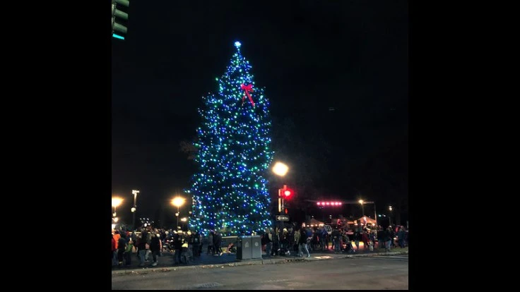 The Christmas tree is covered in 2,500 LED, C-9 bulbs stretching over 3,125 feet in length. The giant red bow is 10 feet tall and there are 6 large light bursts that top the tree.