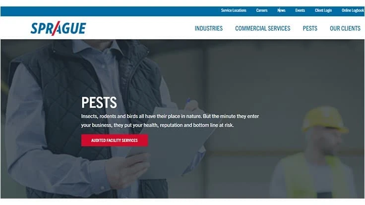 The website also features a list of Sprague’s comprehensive service offerings from no-prep bed bug services to risk assessments and disinfection services, case studies, news, pest identification tools, and a timeline of