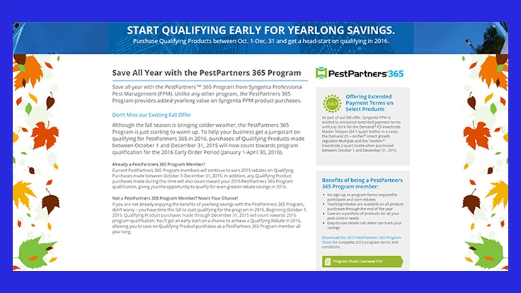 GREENSBORO, N.C. – Although the fall season is bringing colder weather, the PestPartners 365 Program is just starting to warm up. Between Oct. 1 and Dec. 31, 2015, qualifying purchases of Syngenta Professional Pest Management (PPM) products will count towards the 2016 PestPartners 365 Early Order Period (Jan. 1 – April 30, 2016). Instead of four months of qualification time, pest management professionals (PMPs) now have even more time to reach the minimum qualifying rebate needed to participate in this unique yearlong savings program.
