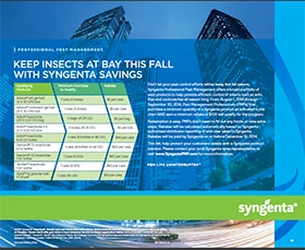 Syngenta Professional Pest Management offers a broad portfolio of pest products to help provide efficient control of insects such as ants, flies and cockroaches all season long. From now through September 30, 2014, pest management professionals (PMPs) that purchase a minimum quantity of a Syngenta product as indicated in the chart AND earn a minimum rebate of $100 will qualify for this program.