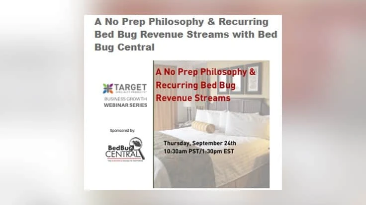 Description: Join Target Specialty Products for a free webinar on Sept. 24, presented by Danny White, training specialist/national account manager for BedBug Central. White will present on the topic “ A No Prep Philosophy & Recurring Bed Bug Revenue Streams.”