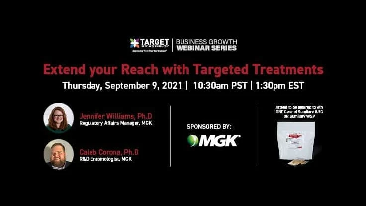 Join Target Specialty Products and MGK’s Drs. Jennifer Williams and Caleb Corona to learn how you can extend your reach with targeted treatments using residual larvicides while also delivering labor savings and trusted control. Attend this webinar for a chance to win a free case of either Sumilarv 0.5G or Sumilarv WSP.