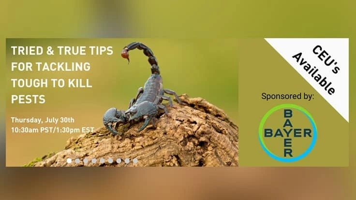 Description: On Thursday, July 30th Target Specialty Products and sponsor Bayer invite pest and vector professionals to join them for a free Business Growth Webinar Series on ‘Tried & True Tips for Tackling Tough to Kill Pests.’ Re-certification credits have been applied for; for more details click here.