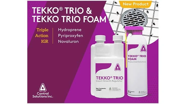 Control Solutions, Inc. has introduced Tekko Trio, a triple-action insect growth regulator (IGR). This first-ever triple IGR product is powered by hydroprene, pyriproxyfen, and novaluron. Tekko Trio, a concentrated formulation works by disrupting the life cycle of listed pests, stopping normal development and inhibiting egg production. This means the population cannot grow, the manufacturer reports..