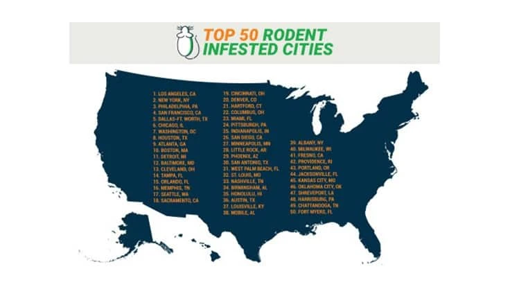 Terminix based the rankings on the number of requests received for help with rats and/or mice from each city over the past year.* The top 50 cities for rodent infestations in the United States are: