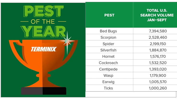 The almanac details internet search and social media data for 52 common pests, including critters from cockroaches to weevils, to determine which pests Americans had a bug for this year. Bed bugs were followed by scorpions, spiders and silverfish at the top of the list, demonstrating their massive infestation of Americans’ collective curiosity.