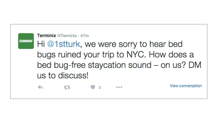 (watch video), Terminix reached out to the couple via Twitter, and offered them a bed bug-free “staycation” at a Terminix-treated hotel (plus a night on the town!) in their California hometown. Terminix tweeted out the following message: