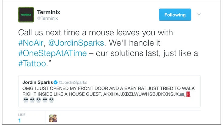 No more results found. The Terminix team responded today, saying, “Call us next time a mouse leaves you with #NoAir, @JordinSparks. We'll handle it #OneStepAtATime – our solutions last, just like a #Tattoo.” – referencing several of Sparks’ biggest hits.