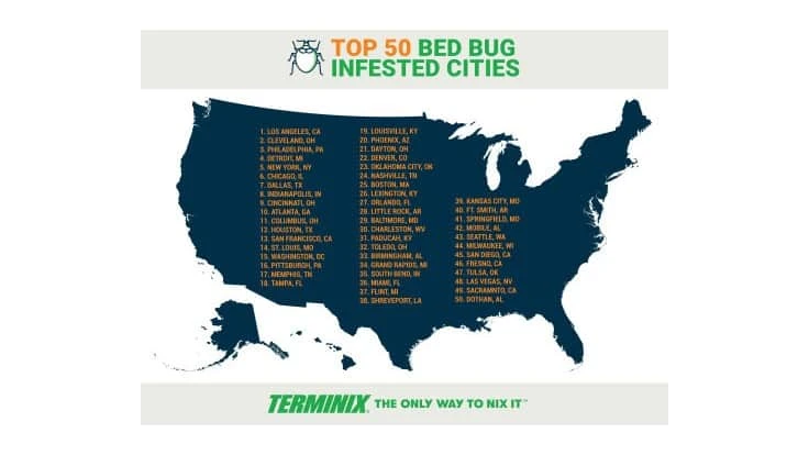 Terminix based its rankings on the number of requests received from each city in 2021*. The top 50 cities for bed bug infestations in the United States are: