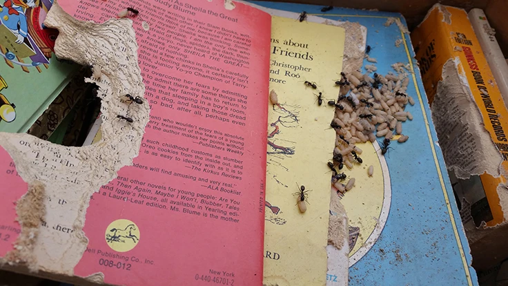 Fox then examined a makeshift shelf in the shed’s rafters that was holding a variety of boxes. “The first box I opened contained a large number of worker carpenter ants (C. pennsylvanicus) and pupae. I found it very interesting to see the damage to the books and when I came to the realization that the hollow areas between the stored books provided an ideal location to establish a satellite nest. The main colony was in a tree just adjacent to the shed.”