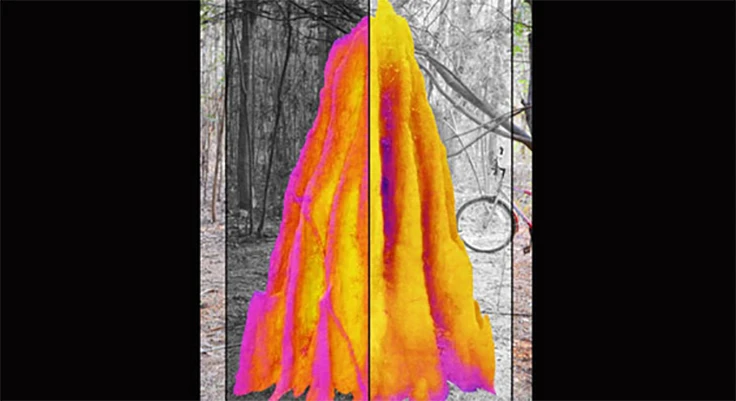 (Photos by Hunter King and Naomi Ocko: Thermal images superposed on a photograph of a termite mound (photo 1). At night (left side) the flutes are cooler, so the air first moves down them and then up the central core. During the daytime (right), the warmer air reverses the process, moving air up the flutes and then down the central core. Occurring once a day, it allows CO2 from deep inside the mound to surface and diffuse through the porous walls (photo 2). Thus the mound works like a slowly breathing lung, powered by daily temperature oscillations.)