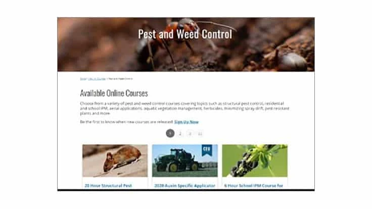 Participants can choose from a course in the basics of managing aquatic vegetation, the basics about ants, aerial pesticide application, residential IPM or a growing selection of more than 20 other courses. A range of CEUs and exam preparation options are available.