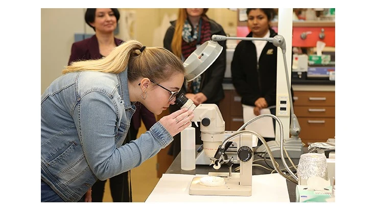 (Photo: Lisa Cunningham, of Switzerland County High School, examines a tick under a microscope as part of a campus visit for the Tick INsider program. More than a dozen Indiana high school students are trained to collect ticks around the state so that Purdue scientists can analyze them and map the pathogens present in the state's tick population. (Purdue Agricultural Communication photo/Tom Campbell))