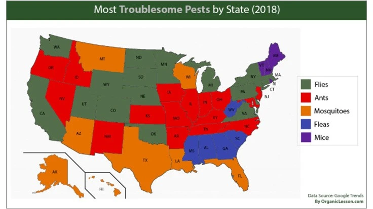 Flies, ants, and mosquitoes caused the most widespread problems among US households according to a recent study by Organic Lesson. The three insects were identified as the top-searched pests across forty-one states, and they also accounted for 34% of total DIY pest control searches in the US.