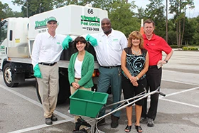 Tom Donovan, Lawn and Shrub Service Manager, Denise Wartan, General Manager, Karl Ellis, Pest Control Technician, all of Trad's Pest Control of Jacksonsville, Florida, are joined by Cookie Morton of Univar and Bruce Ryser of FMC Professional Solutions. The group came together to donate a fire ant treatment to San Juan del Rio Church and School, a local school that had a major fire ant problem due to 2013's excessive rains. Trad's donated their time while FMC Professional Solutions donated their Talstar XTRA granular insecticide featuring Verge technology. |