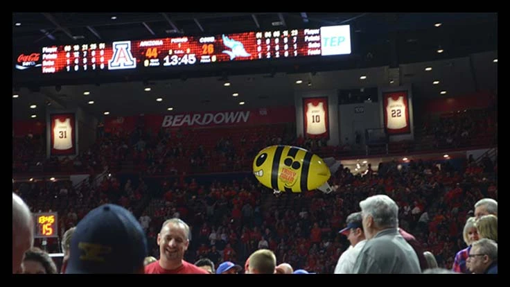 TUCSON, Ariz. – Seven years after debuting an 11-foot-long remote controlled mousecar-looking blimp that appears during Arizona Wildcat basketball games, Truly Nolen launched a new blimp shaped like a bee to kick off Arizona’s Pac-12 home schedule last night.