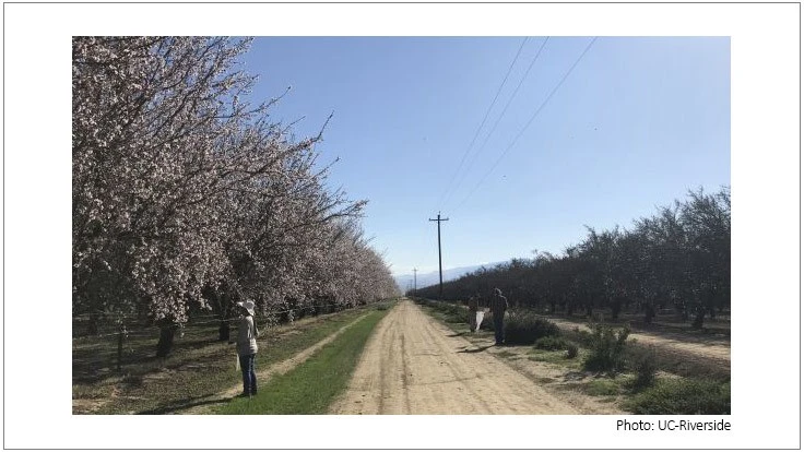 (Photo: UCR researchers conducting a field study on pollinator health at an almond field in California’s Central Valley.)