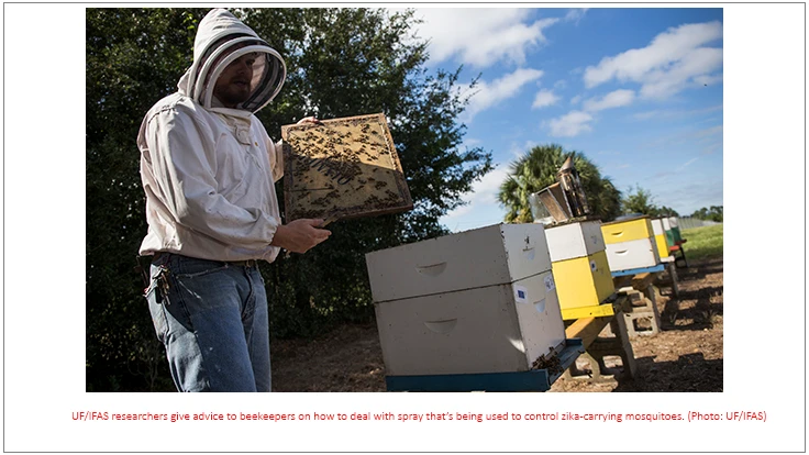 “With the Zika cases in south Florida, and now that scientists have identified mosquitoes that carry the Zika virus, we would expect beekeepers to be concerned about increased pesticide application,” Fishel said. “But, registered beekeepers should be notified before an application of pesticides. That gives them time to protect their bees while spraying is conducted.”