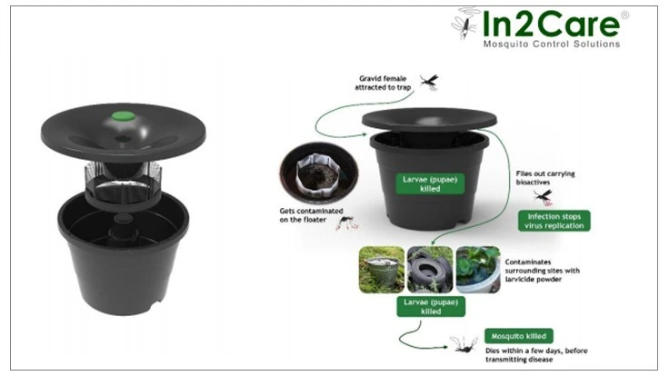 The In2Care Mosquito Trap takes advantage of the mosquito life cycle and breeding habits. Aedes mosquitoes prefer dark, container-like breeding sites and typically lay eggs in not just one, but in multiple sites. The Trap is based on the latest scientific knowledge and uses an organic odor lure to attract mosquitoes. It has a floater with bioactive-coated gauze that targets the mosquito in a 1-2 punch: