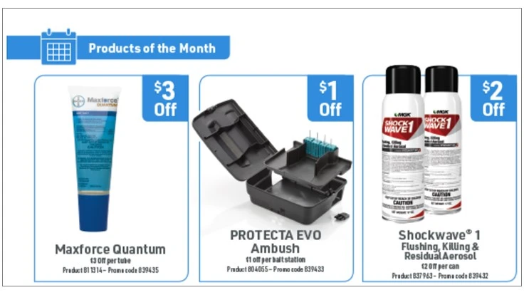 Throughout May, PMPs can get savings on Maxforce Quantum from Bayer; Protecta EVO Ambush from Bell Laboratories and Shockwave 1 from MGK.