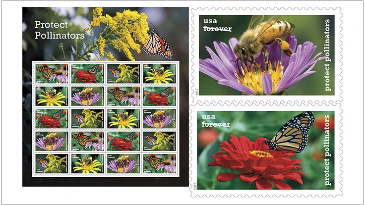 “Bees, butterflies and other pollinators sustain our ecosystem and are a vital natural resource,” said U.S. Postal Service Judicial Officer Gary Shapiro, who dedicated the stamps. “They are being threatened and we must protect them.”