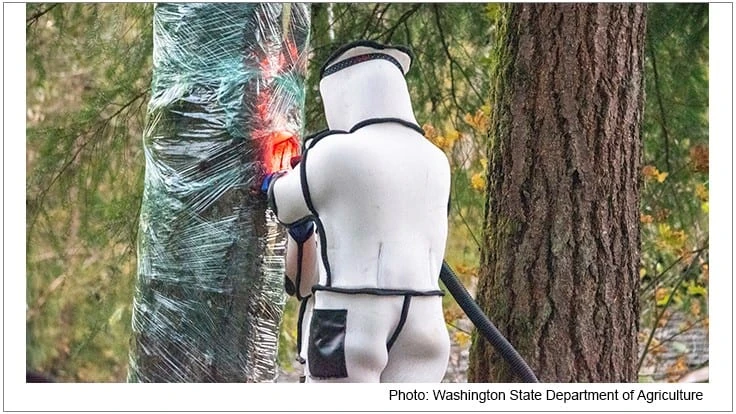 “The eradication went very smoothly, even though our original plan had to be adapted due to the fact that the nest was in a tree, rather than the ground,” managing entomologist Sven Spichiger said. “While this is certainly a morale boost, this is only the start of our work to hopefully prevent the Asian giant hornet from gaining a foothold in the Pacific Northwest. We suspect there may be more nests in Whatcom County.”