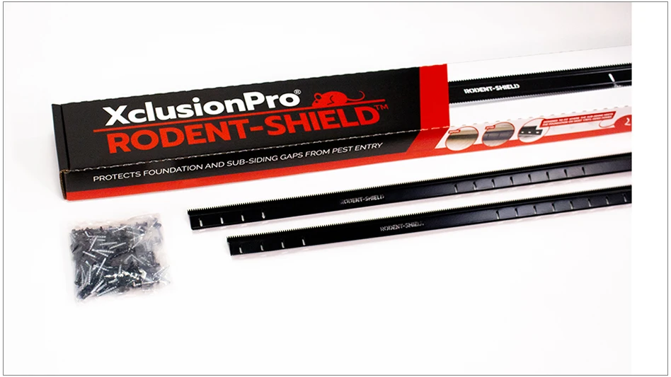 XclusionPro Rodent-Shield is designed to prevent small rodents from entering homes through foundation gaps between the sub-siding and bottom sill plate. It fits snugly against the house beneath the siding and can be attached to either the sub-siding, sill plate, or the foundation, depending on the situation. XclusionPro Rodent-Shield is made from 16ga powder-coated galvanized steel. Each box includes 175 linear feet of Rodent-Shield and 200 sub-siding fasteners.