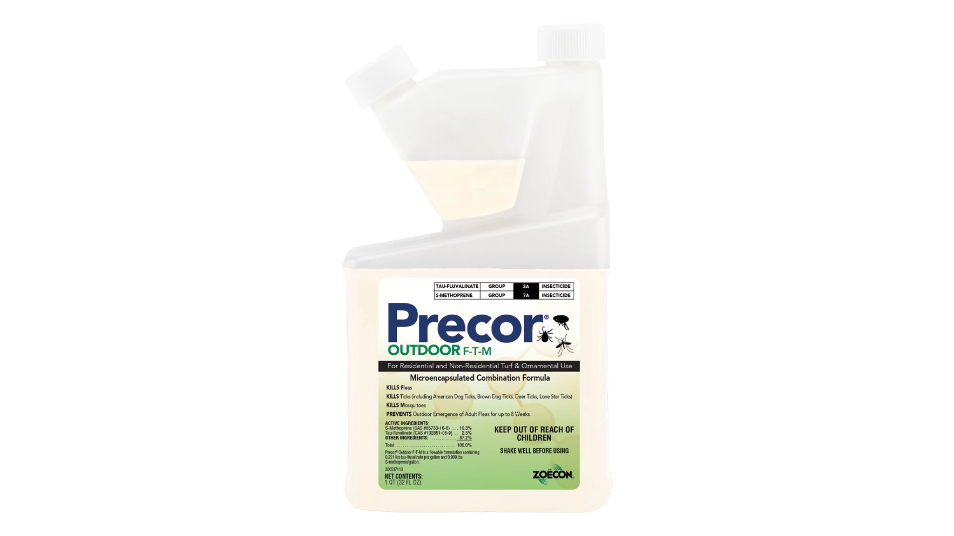 Precor Outdoor F-T-M is engineered to kill fleas, ticks, mosquitoes and over 50 other pests, and prevents outdoor emergence of adult fleas for up to eight weeks. Broad-spectrum, long-lasting, and EPA-registered, Precor Outdoor F-T-M is approved for use on residential lawns, commercial landscapes, parks, and more.