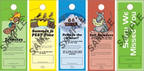Compelling Communications announces a series of seasonal door hangers to enable pest control companies to more effectively market their services. There are five designs, one for each season plus a “Sorry We’ve Missed You” card and each is designed in bold, eye-catching colors. The affordable, oversized door hangers are guaranteed to be noticed and can be easily attached to door knobs by technicians as they cloverleaf around the homes they’ve serviced.