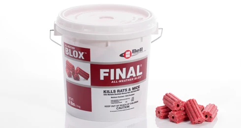 FINAL BLOX is a powerful all-weather Blox bait containing the single-feeding anticoagulant Brodifacoum. FINAL's multi-edge design gives rodents plenty of gnawing edges. This weatherable 20 gram Blox easily fits down burrows, in tight baiting areas and in bait stations.