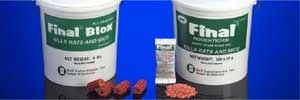 FINAL combines Bell's highly palatable bait formulation with the powerful active ingredient, Brodifacoum, the strongest, single-feeding anticoagulant on the market today. FINAL is effective on both rats and mice. It works especially well to clean out persistent mouse infestations where control is difficult or resistance is suspected.